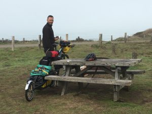 Nach dem Frühstück traf ich Callum, welcher in der Nähe im Einmannzelt übernachtet hatte. Er war mit seinem Rocky Mountain – Bike mit BOB-Anhänger von Whistler/ BC nach San Francisco unterwegs, wo er einen Freund besuchen wollte. Als er abreiste, schenkte ich dem radelnden Raucher eine meiner Ziggi-Boxes.